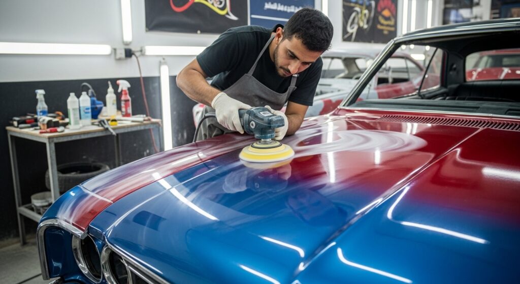 - مرحلة التنعيم (Polishing): تهدف إلى إظهار الانعكاس الصافي للون وتجهيز السطح للحماية.