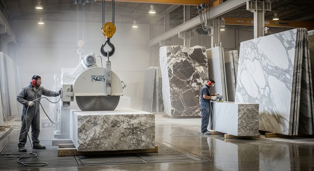 في مصنع رخام ترى الحجر في شكله الخام، ثم يتم معالجته تحت إشراف متخصصين. هذا يعني أن كل قطعة تمر بفحص دقيق قبل أن تصبح جاهزة للتسليم.