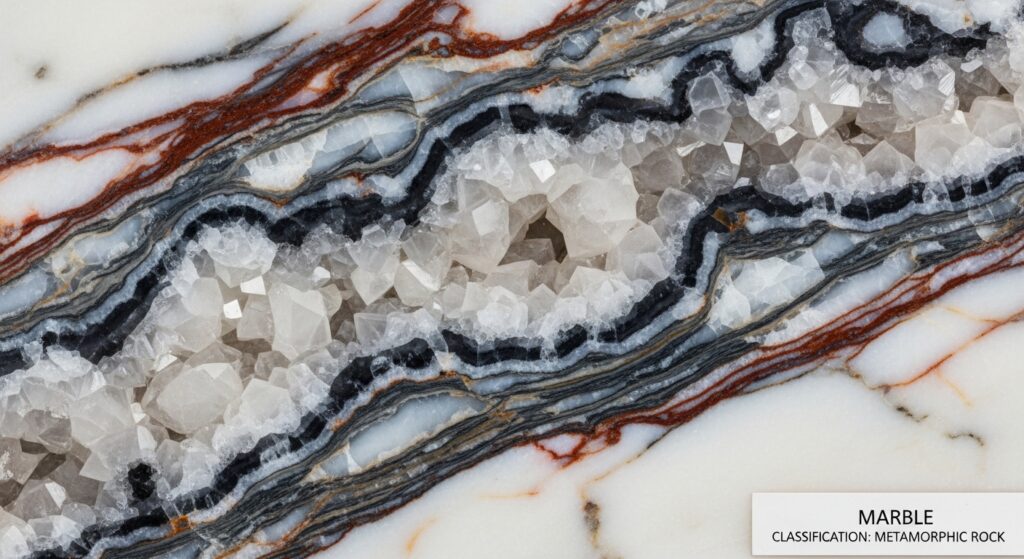 عندما تعرّض الحجر الجيري لحرارة شديدة وضغط قوي داخل الأرض، تغيّرت مكوناته، وأصبح أكثر صلابة ولمعانًا، فتحوّل إلى رخام.
